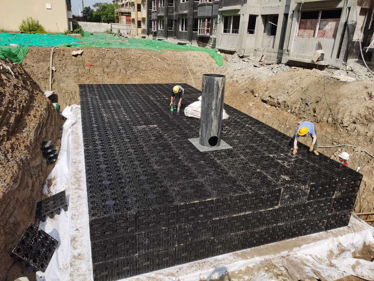 該項目雨水回收系統采用地埋PP模塊組合水池的方式收集雨水,前期經過截污掛籃、棄流過濾,后期通過地埋一體機過濾,消毒,最終使水質達到規范標準,用于廠區綠地的澆灑,景觀補水,道路沖洗。